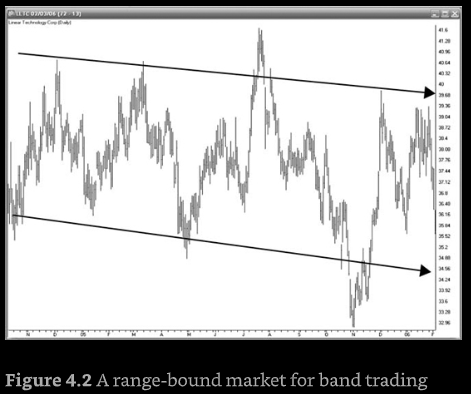 The second concept that people can successfully trade is band trading. Here we make the assumption that the markets we are trading are somewhat range bound. Such markets go up for a limited period of time until they reach he top of the range. These markets then turn down for a limited period of time until they reach the bottom of the range. Figure 4.2 shows an example of a range-bound market that you could use to trade bands.