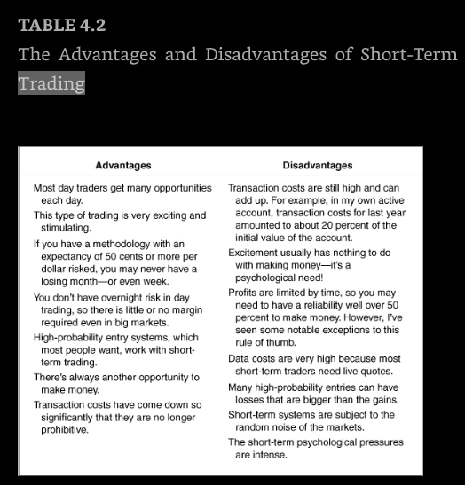 Shorter-term trading (which might be anything from day trading to swing trading of one to five days ) has different advantages and disadvantages. These are illustrated in Table 4.2. Read through the list and then compare it with the long-term table. Once you’ve done so, you can then decide for yourself what best fits your personality.