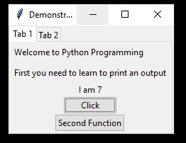 I have added two function buttons in the first tab (tab1). If you click these buttons, two functions will be triggered. One function will display stuff in tab1 and another function will show stuff in tab2.