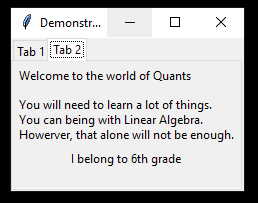 from tkinter import * from tkinter.ttk import * import time from threading import * root = Tk() root.title("Demonstrating Tabs in Tkinter") tabControl = Notebook(root) tab1 = Frame(tabControl) tab2 = Frame(tabControl) tabControl.add(tab1, text='Tab 1') tabControl.add(tab2, text = 'Tab 2') tabControl.pack(expand = 1, fill="both") text = "You will need to learn a lot of things.\nYou can being with Linear Algebra.\nHowerver, that alone will not be enough." label_1 = Label(tab1, text="Welcome to Python Programming") label_1.grid(row=0,column=0, padx=5,pady=5, sticky="nw") label_2 = Label(tab1, text="First you need to learn to print an output") label_2.grid(row=1,column=0, padx=5,pady=5) label_1 = Label(tab2, text="Welcome to the world of Quants") label_1.grid(row=0,column=0, padx=5,pady=5,sticky="nw") label_2 = Label(tab2, text=text) label_2.grid(row=1,column=0, padx=5,pady=5,sticky="nw") #sticky can take the following values : "n", "s", "e", "w", "ne", "nw", "se", "sw" func_1_display = Label(tab1) func_1_display.grid(row=3, column=0) func_2_display = Label(tab2) func_2_display.grid(row=3, column=0) def func_1(): for x in range(20): func_1_display.config(text=f"I am {x}") time.sleep(0.5) def func_2(): for x in range(20): func_2_display.config(text=f"I belong to {x}th grade") time.sleep(0.5) def threading_func_2(): t_func_2=Thread(target=func_2) t_func_2.start() def threading_func_1(): t_func_1=Thread(target=func_1) t_func_1.start() func_1_button = Button(tab1, text="Click", command=threading_func_1) func_1_button.grid(row=4, column=0) func_2_button = Button(tab1, text="Second Function", command=threading_func_2) func_2_button.grid(row=5, column=0) mainloop() |