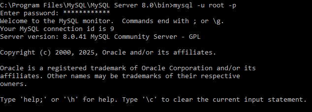 C:\Program Files\MySQL\MySQL Server 8.0\bin>mysql -u root -p |