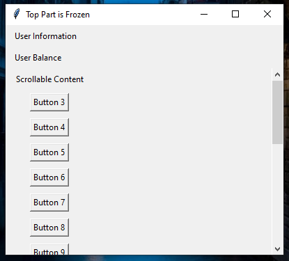 The following image shows a Tkinter window with a scrollable frame , where the top part is frozen.